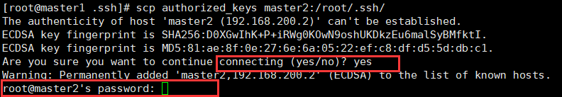 用 scp 命令复制 authorized_keys 到 master2 的 /root/. ssh/目录下,中间需要确认输入密码